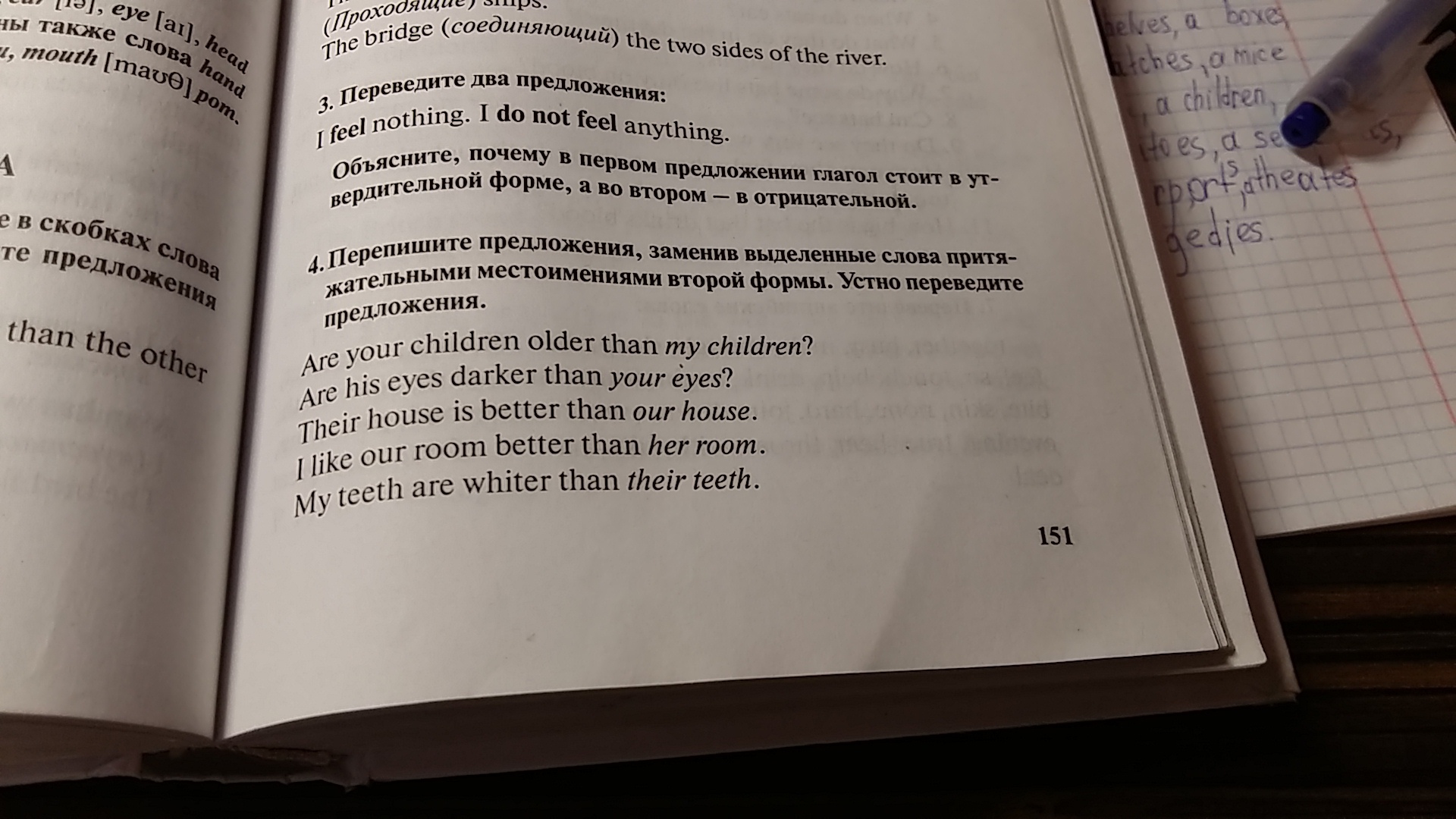 Перевод :1)Мои дети ?2)Ваши глаза ?3)Наш дом ?4)Ее номер ?5)Зубы ?Если заменить прит . мест . :1)Are your children older tnan mine children ? Ваши дети старше, чем дети мои ?2)Are his eyes darker than yours eyes ? Его глаза темнее, чем твои глаза ?3)Their house is better than our house . Их дом лучше, чем наш дом .4)I like our room he better than hers room .Мне нравится наш номер он лучше, чем ее номер . 5) My teeth are whiter theirs teeth .Мои зубы белее их зубов.
