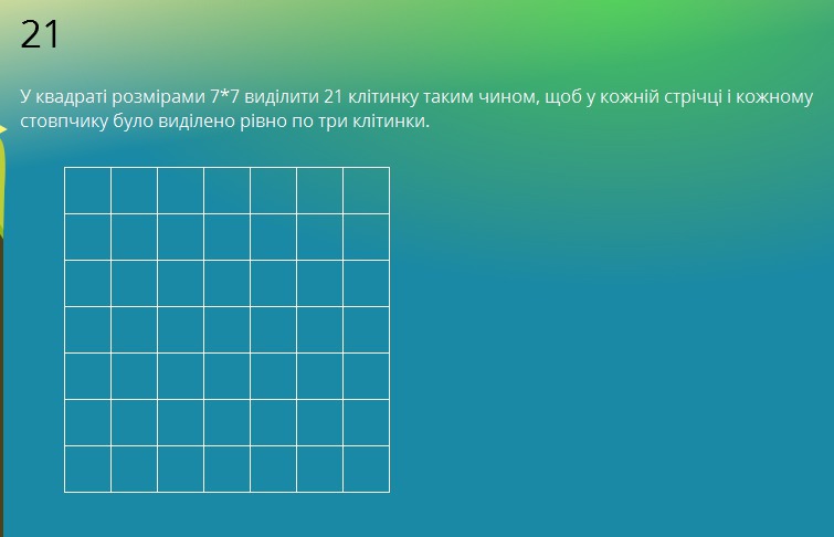 В квадрате размером 7 на 7 выделить 21 клетку таким образом, чтобы в каждом ряду и столбике было по 3 клетки
