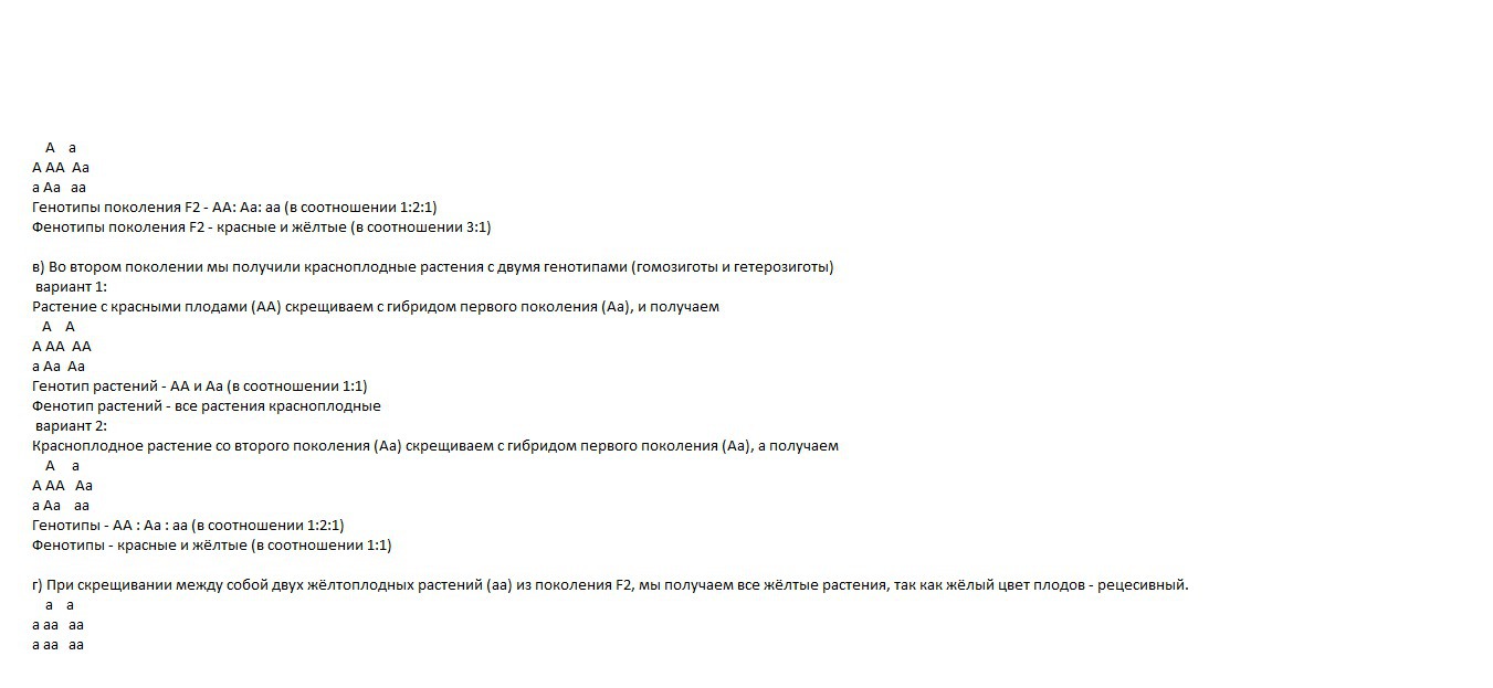 г) При скрещивании между собой двух жёлтоплодных растений (аа) из поколения F2, мы получаем все жёлтые растения, так как жёлый цвет плодов - рецесивный.