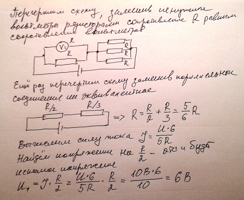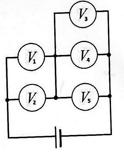 Батарейка имеет напряжение 10 В .В схеме,изображенной на рисунке,использованы одинаковые неидеальные вольтметры.Что будет показывать вольтметр,обозначенный V1 ? Ответ,выраженный в вольтах и округленный до целых.