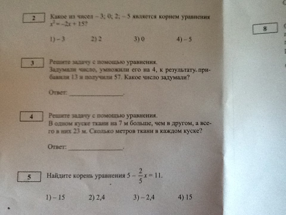 Привет, мне нужна помощь с домашней работой. 2 задание:какое из чисел -3,0,2,-5 является корнем уравнения x в квадрате=-2x+15?