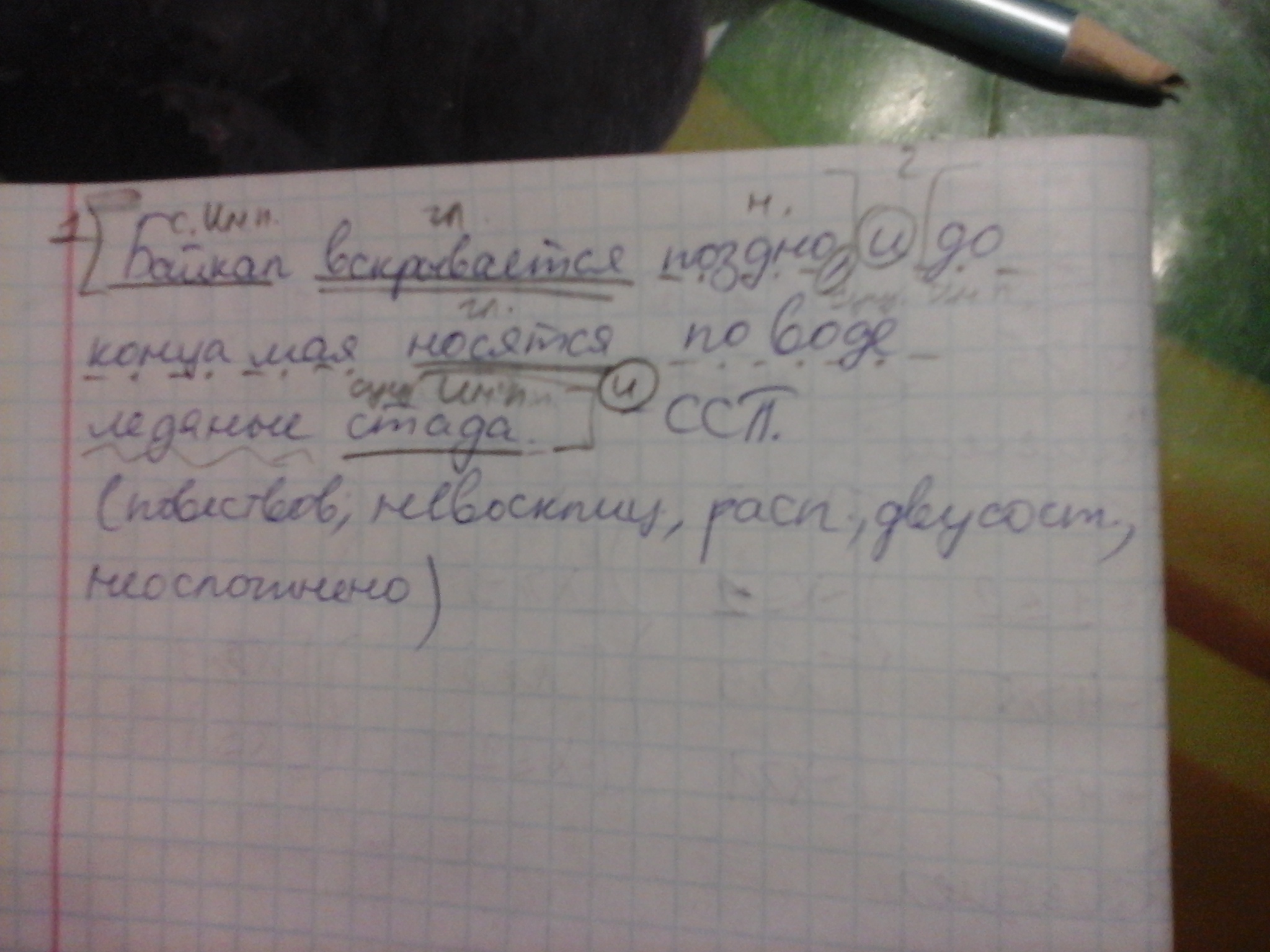 синтаксический разбор предложения. Байкал вскрывается поздно, и до конца мая носятся по воде ледяные стада.