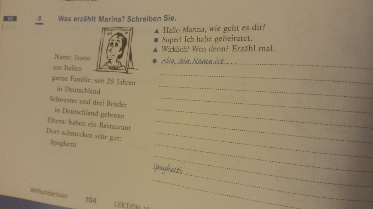 Sein Name ist Ivano. Er ist aus Italien. Er hat eine gute Familie und sie alle wohnen schon 25 Jahre in Deutschland. Die Familie ist nicht klein. Yvonne hat eine Schwester und außer ihm noch drei Brüder, aberdie sind schon in Deutschland geboren. Die Eltern von Yvonne haben sein eigenes Restaurant. Am besten schmecken dort sehr gut Spaghetti