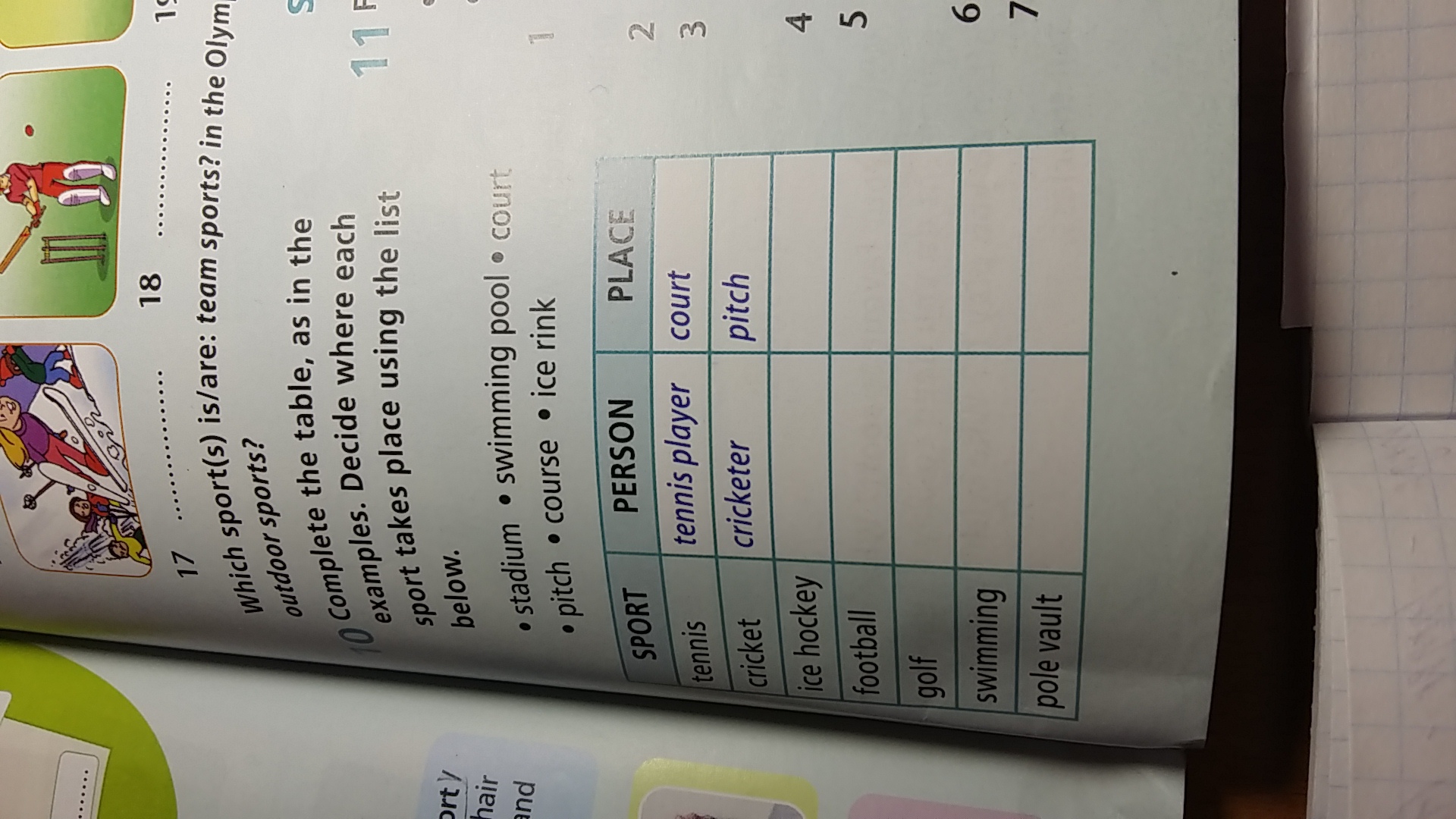 Hockey player, ice rink, football player, football field, golfer, fairway(гладкое поле), swimmer, swimming pool,