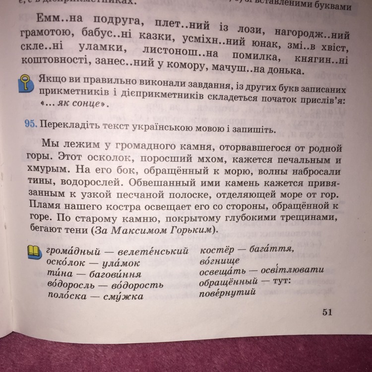 Ми лежимо у велетенського каменя відірвавшогося від рідної гори.Цей уламок,порослий мохом,здається сумним і похмурим.На його бік,звернений до моря,хвилі накидали баговиння,водоростей.Обвішаний ними камінь здається прив'язаним до вузької пісчаної смужки,відділяючої море від гір.Вогонь нашого багаття освітлює його з сторони,оберненої до гори.По старому каменю,покритому глубокими тріщинами бігають тіні.