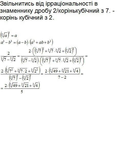 Звільнитись від ірраціональності в знаменнику дробу 2/корінькубічний з 7. - корінь кубічний з 2.