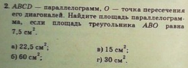 значит площадь параллелограмма АВСД =2*АВС = 2*15 см = 30 см
