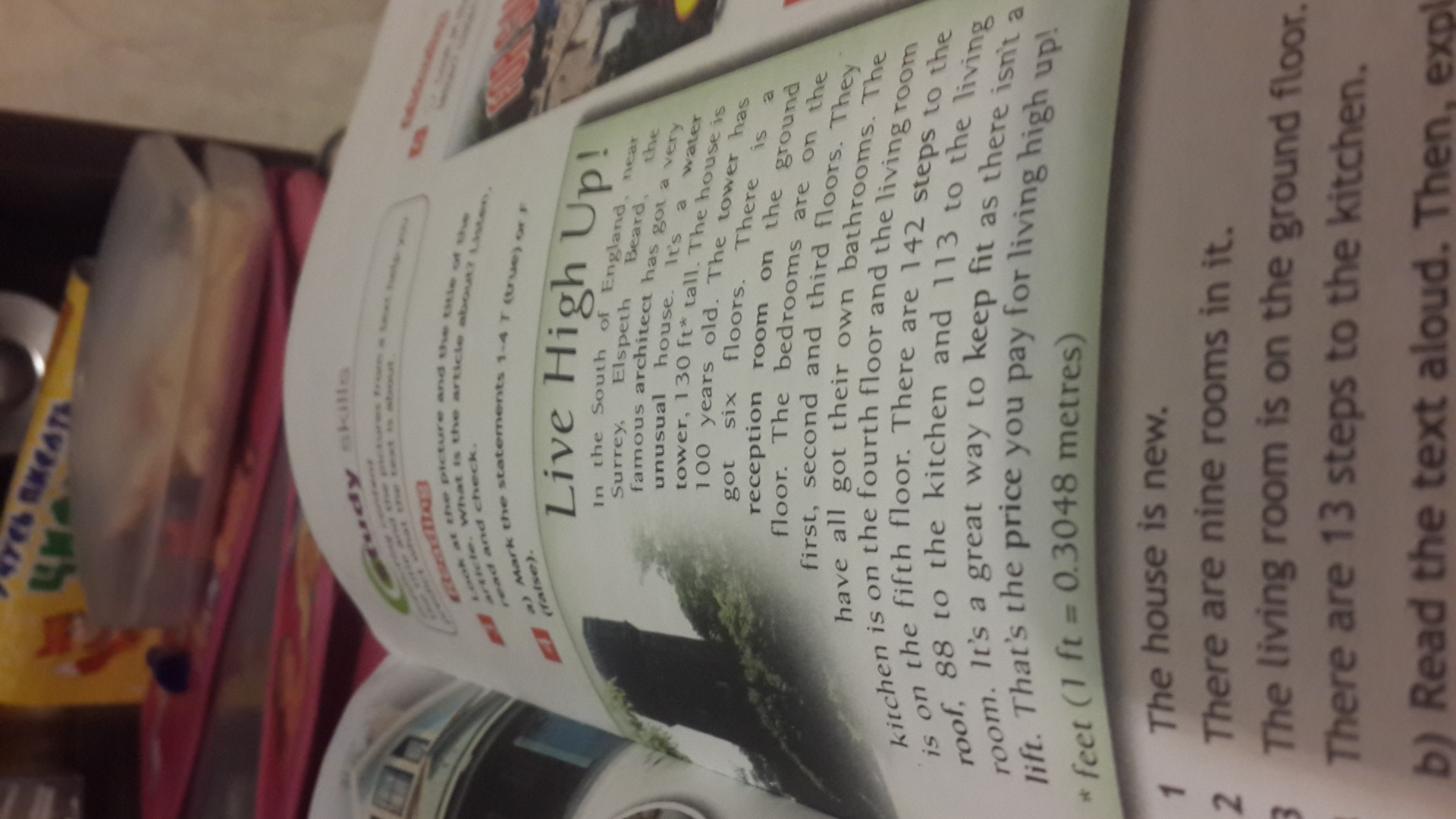 В прямом эфире высоко юге Англии, недалеко от Surrey Элспет Борода, известный архитектор получил очень необычный дом это водонапорной башни, 130 футов высотой. В доме 100 лет. Башня имеет шесть этажей Существует приемная комната на первом этаже Номера расположены на первом, втором и третьем этажах. Все они получили свои собственные ванные комнаты. Кухня находится на четвертом этаже, а в гостиной находится на пятом этаже Есть 112 шагов к крыше 88 на кухню и 113 в гостиной, Это отличный способ поддерживать хорошую физическую форму, поскольку нет лифта. Это цена, которую вы платите за живущих высоко вверх ногами (1 фут 0,3048 метров)