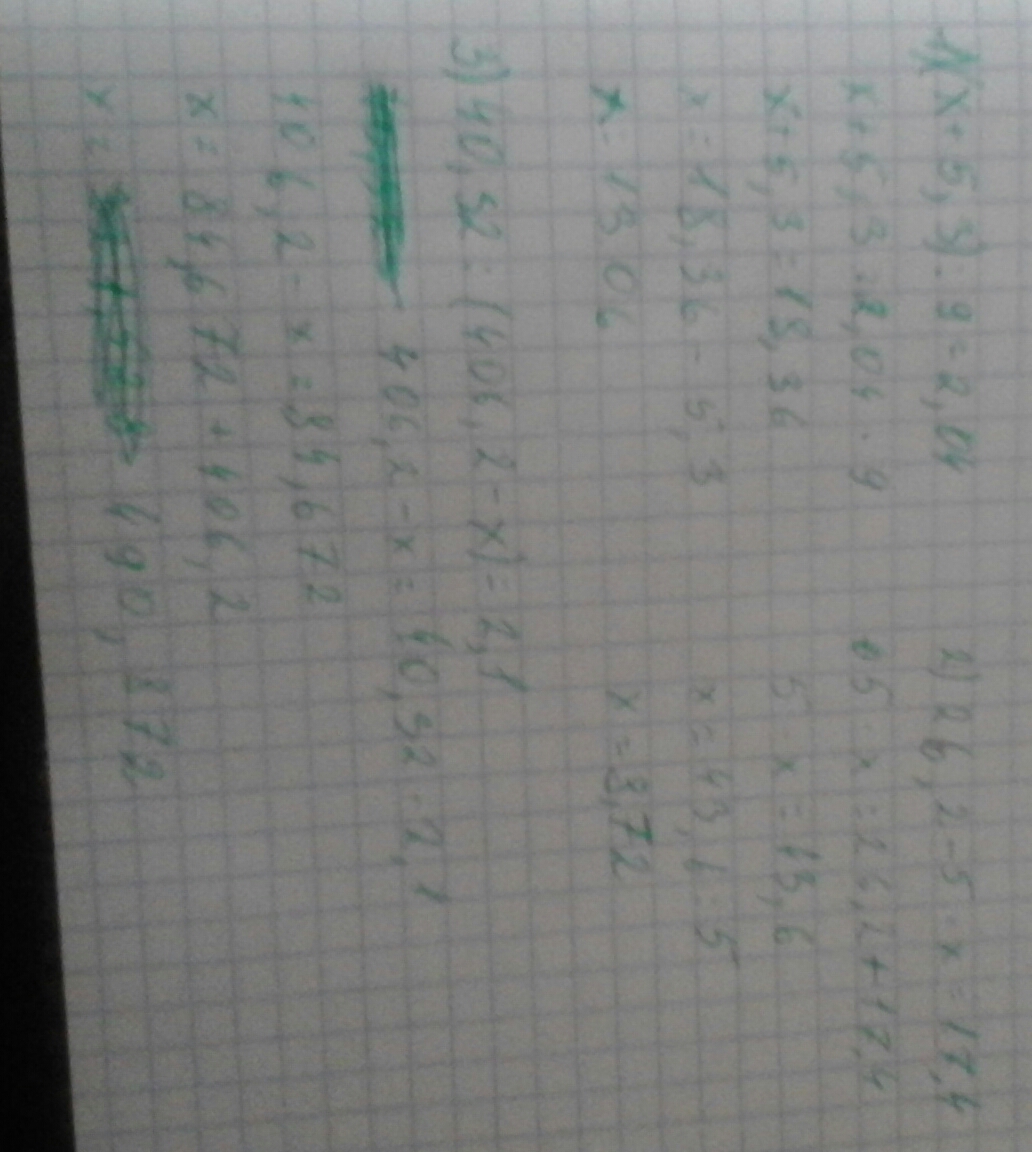 Помогите решить 3 уровнения с задания! 1) (x+5,3):9=2,04 2)26,2-5 * x=17,4 3)40,32 : (406,2-x)=2,1 По действиям!