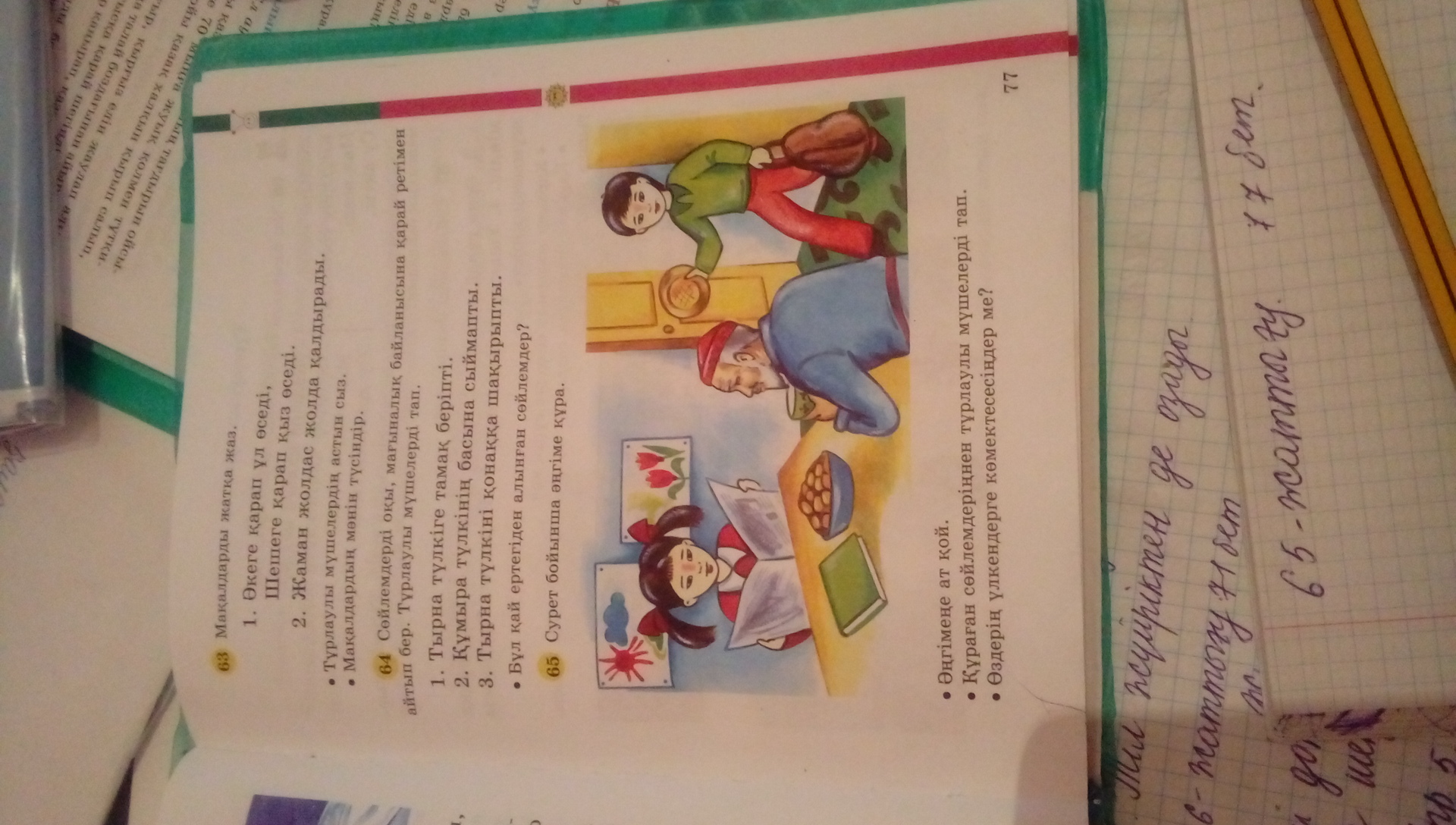 Атасы мен Айжан устел алдында отыр. Атасы бауырсақ пен шəй ішіп отыр,ал Айжан газет оқу үстінде. Ержан сабақтан келді.Ол нан алып келіпті.