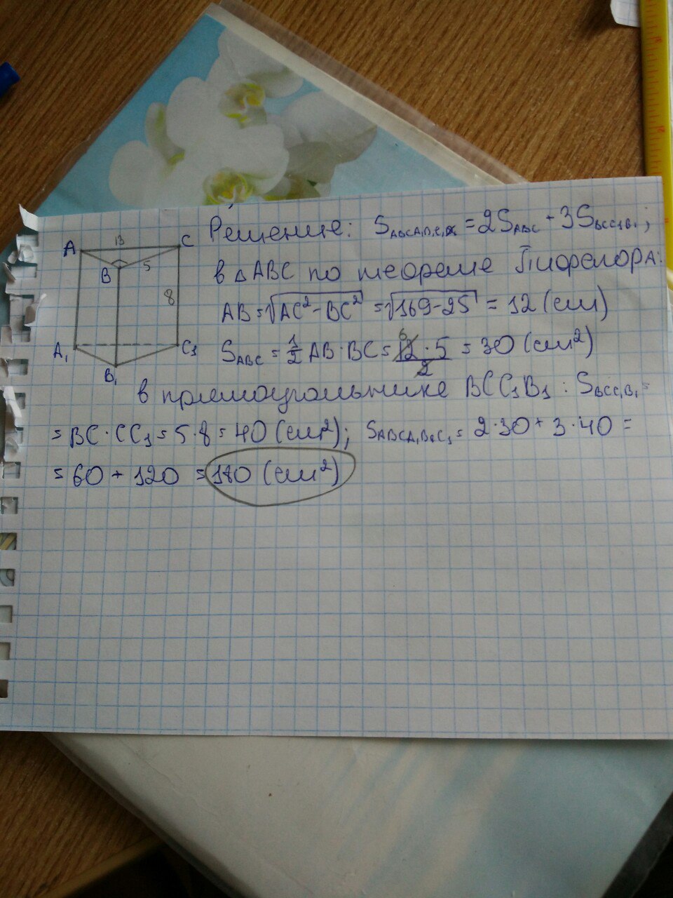Основанием прямой треугольной призмы служит прямоугольный треугольник с катетом 5 см и гипотенузой 13 см. Высота призмы 8 см. Найдите площадь полной поверхности.