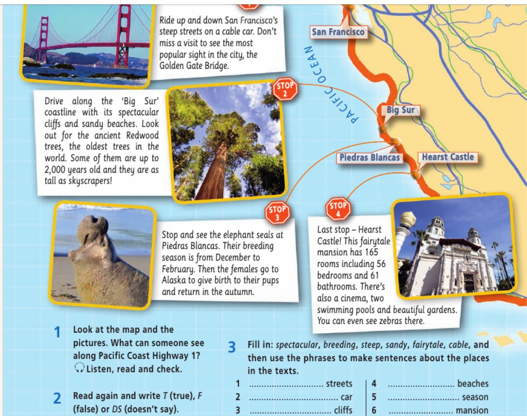 Fill in: spectacular, breeding, steep, sandy, fairytale, cable, and then use the phrases to make sentences about the places in the texts. 1..........streets 2...........car 3...........cliffs 4.........beaches 5...........season 6...........mansion