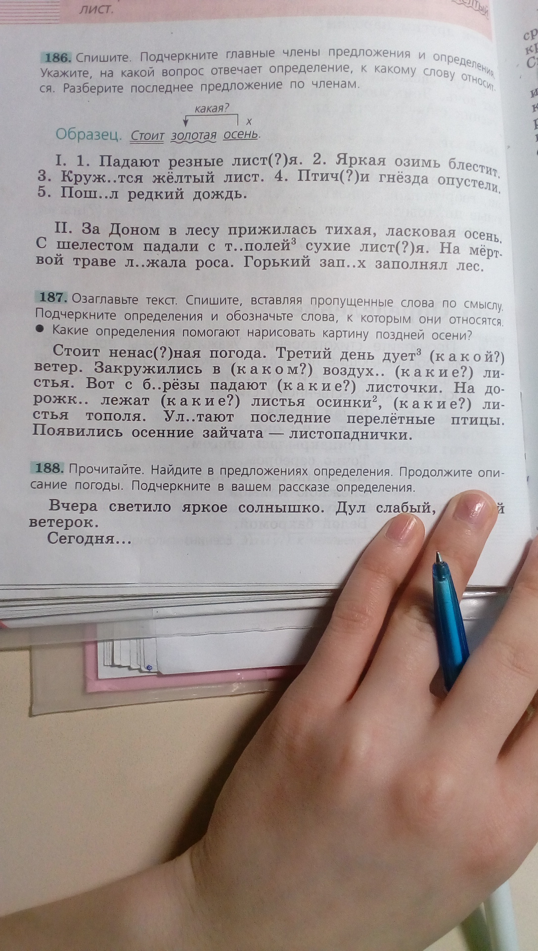 Стоит ненастная(определение) погода. Третий день дует сильный(определение) ветер. Закружились в холодном(определение) воздухе упавшие листья. Вот с берёзы падают жёлтые(определение) листочки. На дорожке лежат красивые(определение, относятся к слову "листья") листья осинки, красные(определение) листья тополя. Улетают последние перелётные(определение) птицы. Появились осенние(определение) зайчата — листопаднички.