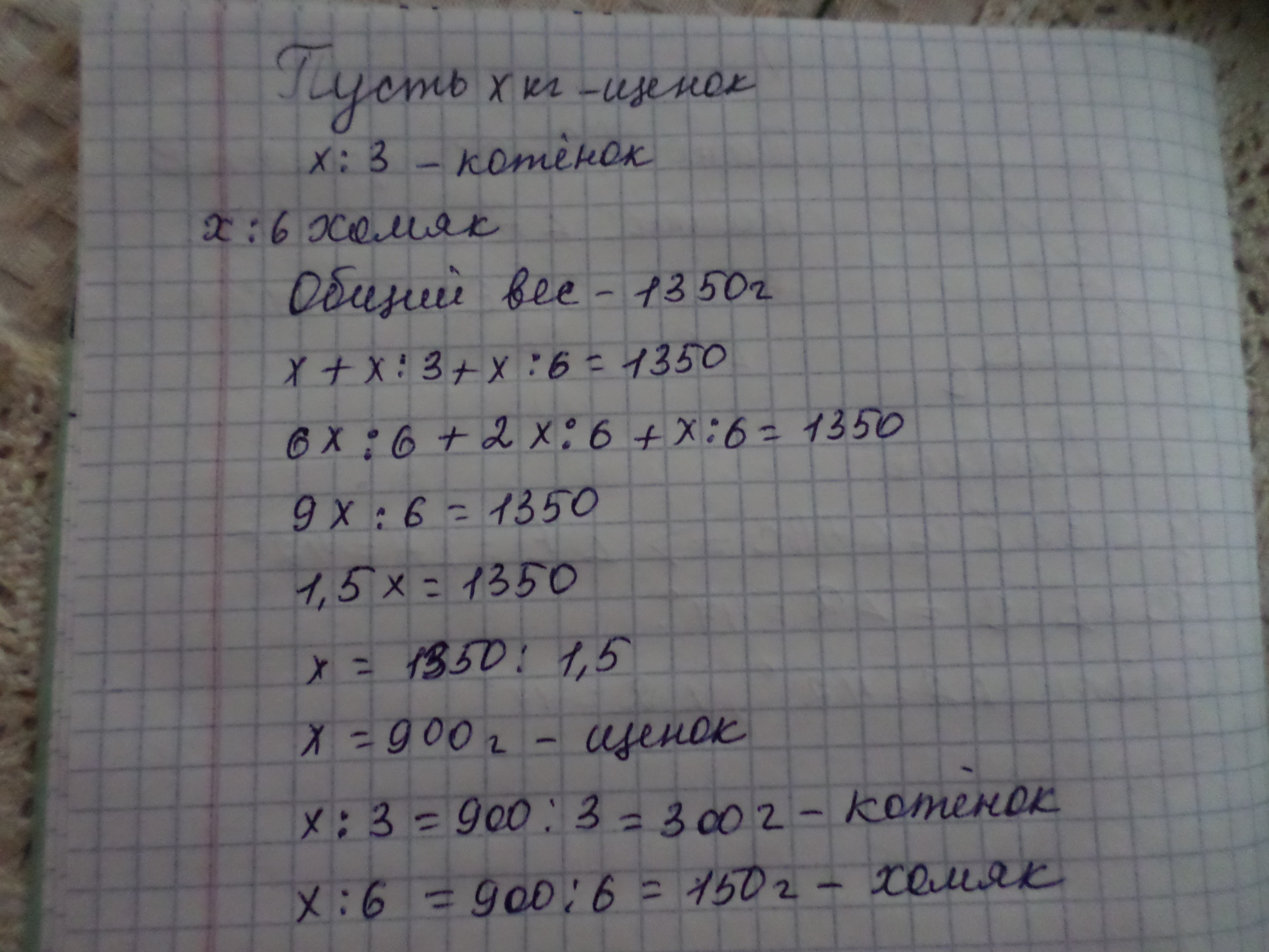 Щенок тяжелее котёнка в 3 раза и тяжелее хомяка в 6 раз а вместе они весят 1 кг. 350 г.сколько весит каждый?