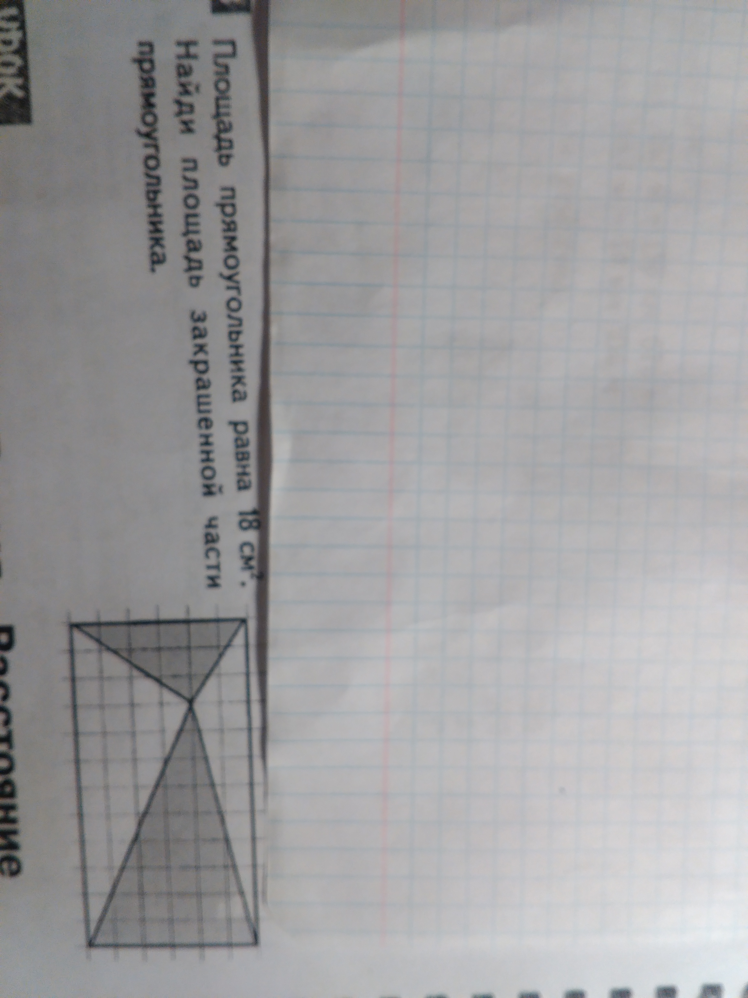 Закрашена половина прямоугольника, т.е. 9 см². Это будет понятно если через общую вершину треугольников сделать разрезы прямоугольника, параллельные его сторона. Получится 4 пары равных треугольников, из которых половина закрашена, а вторая половина - нет.