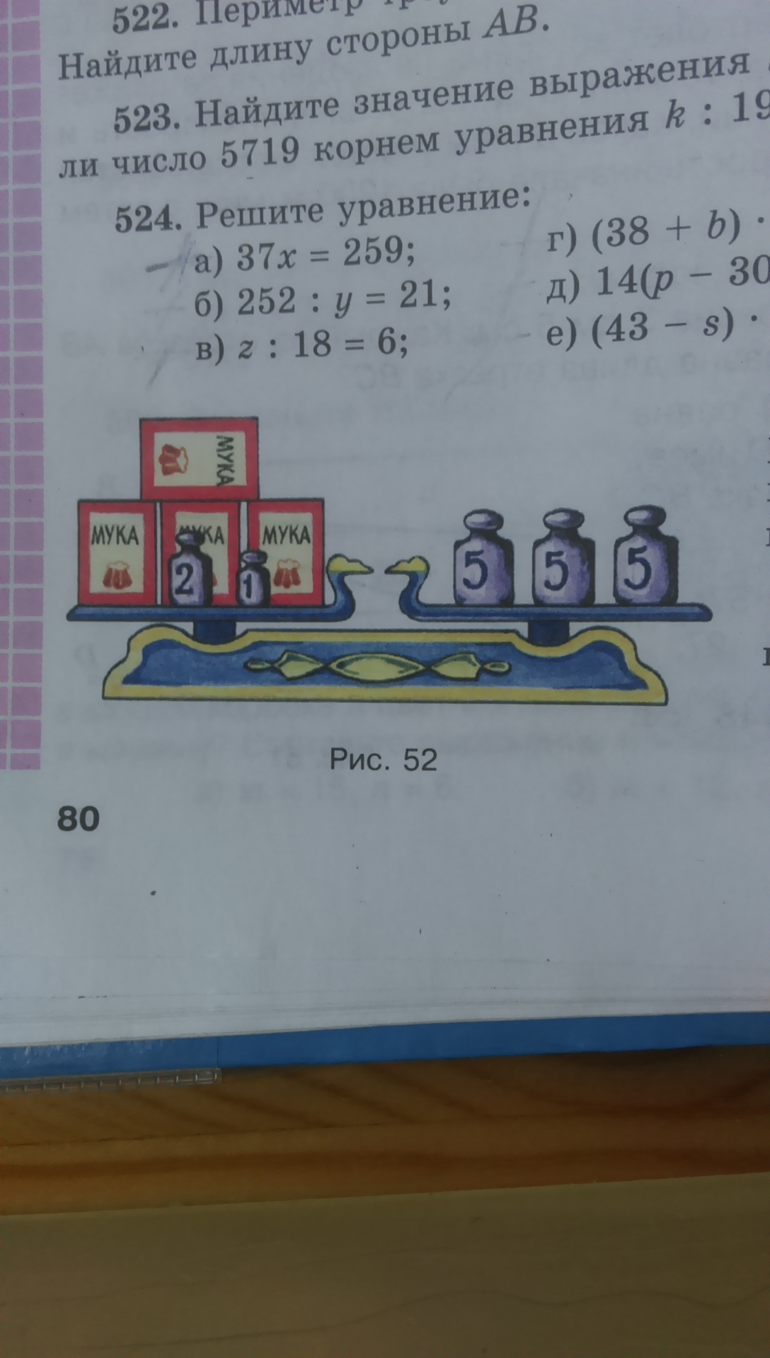 Составьте уравнение по рисунку 52. (Масса гирь дана в килограммах) и найдите массу каждого пакета!