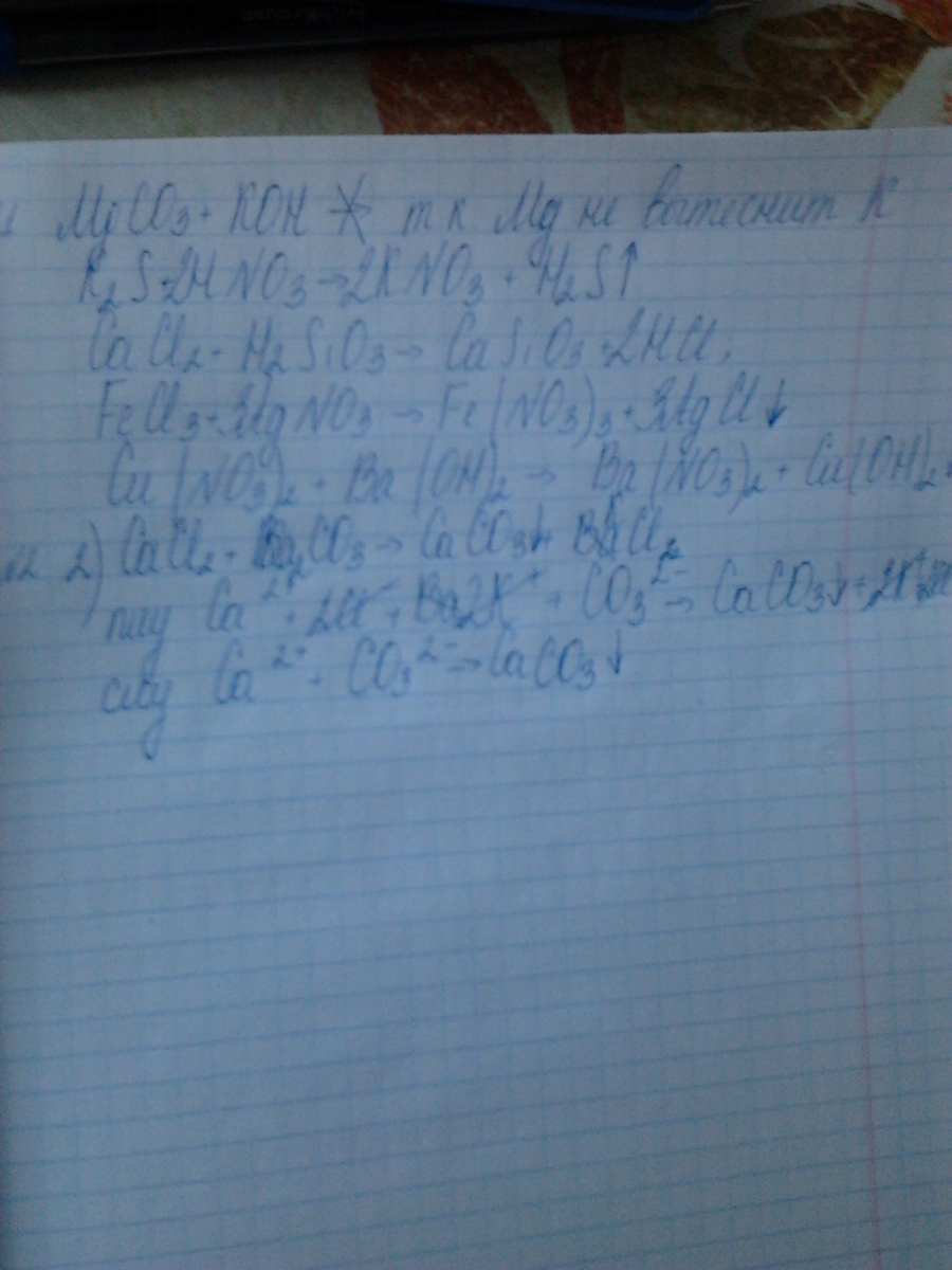 Закончите уравнения возможных реакций. Если реакция невозможна, укажите причину. MgCO3+KOH--> K2S+HNO3--> CaCl2+H2SiO3--> FeCl3+AgNO3--> Cu(NO3)2+Ba(OH)2--> 2.Даны сокращённые ионные уравнения. Составить к ним молекулярные. SO2+2OH-->So3+H2O Ca+CO3-->CaCO3