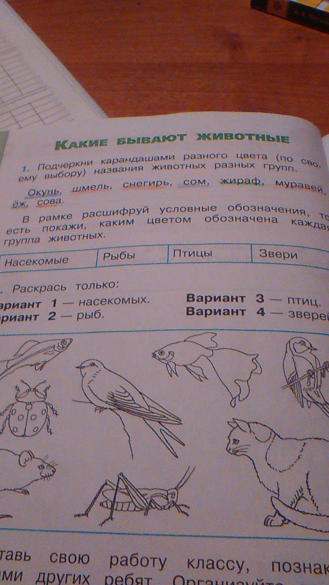Насекомые зелёным шмель муравей рыбы синим окунь сом птицы красным снегирь сова звери желтым жираф ёж