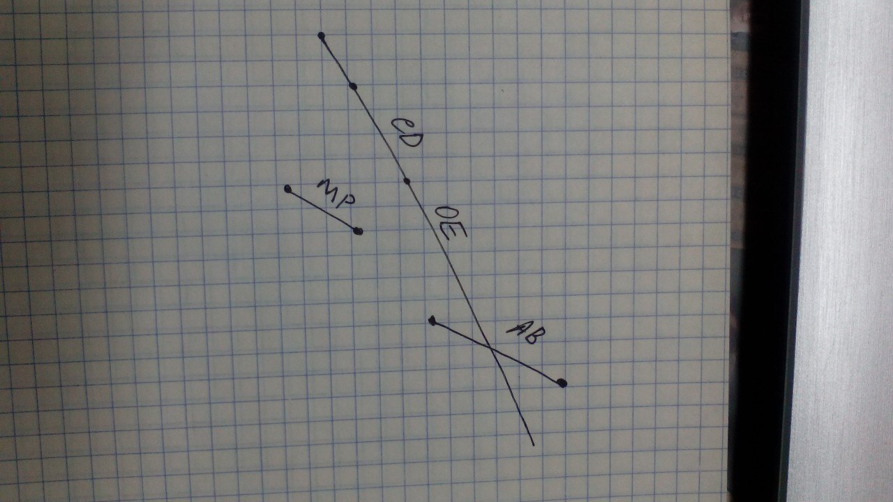начертите луч ОЕ и отрезки АВ, СD и МР так, чтобы отрезок АВ пересекал луч ОЕ, отрезок СD лежал на луче ОЕ, а отрезок МР не пересекал этого луча.