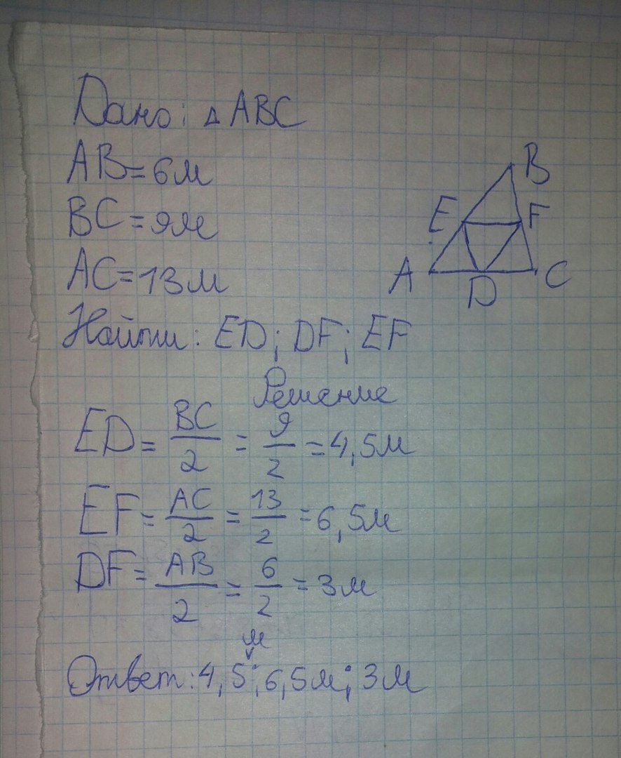стороны треугольника равны 6м,9м,13м.Найдите стороны треугольника,образованного средними линиями данного треугольника(Дано и решения полностью напишите пожалуйста)
