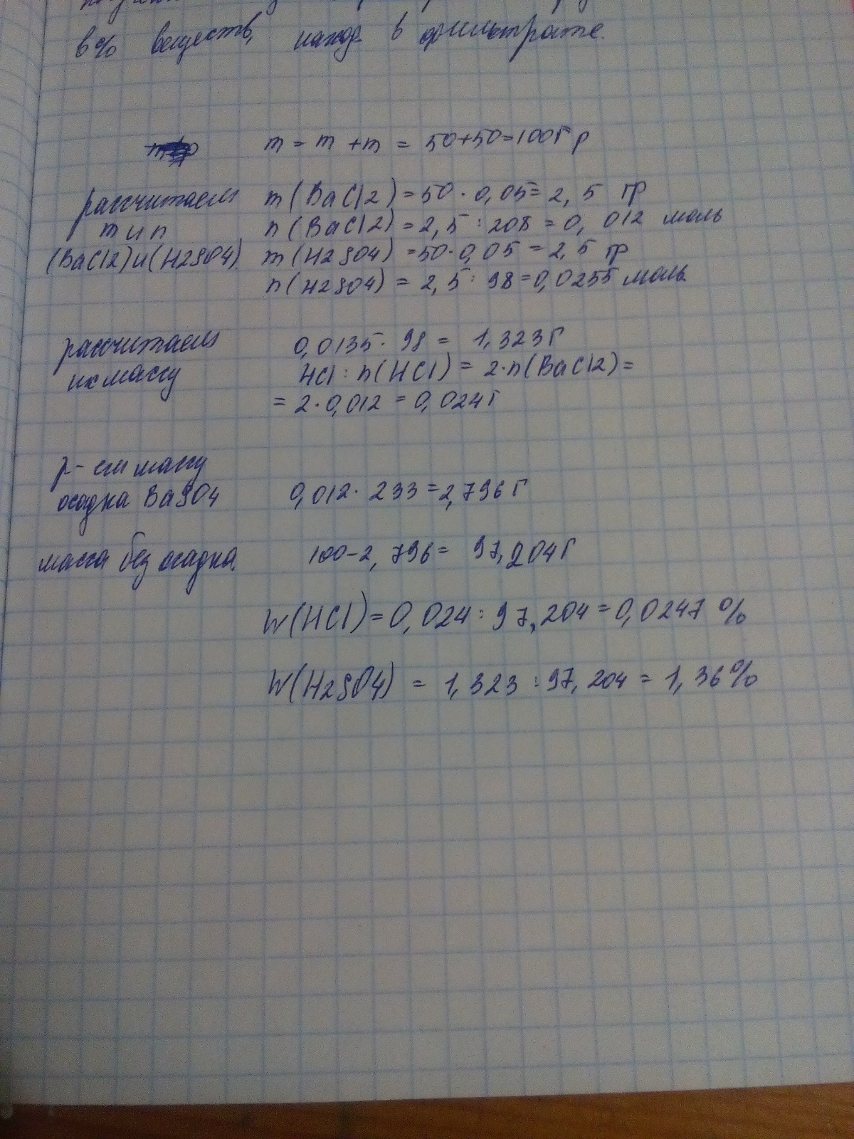 К 50 г 5-процентного раствора хлорида бария прилили 50 г 5 - процентного раствора серной кислоты. Полученный осадок отфильтровали. Определите массовые доли (в %) веществ, находящихся в фильтрате.