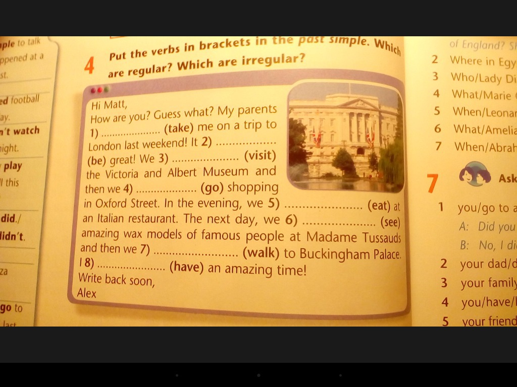 1) taken 2) was 3) visited 4) went 5) eated 6) saw 7) walked. 8) had.