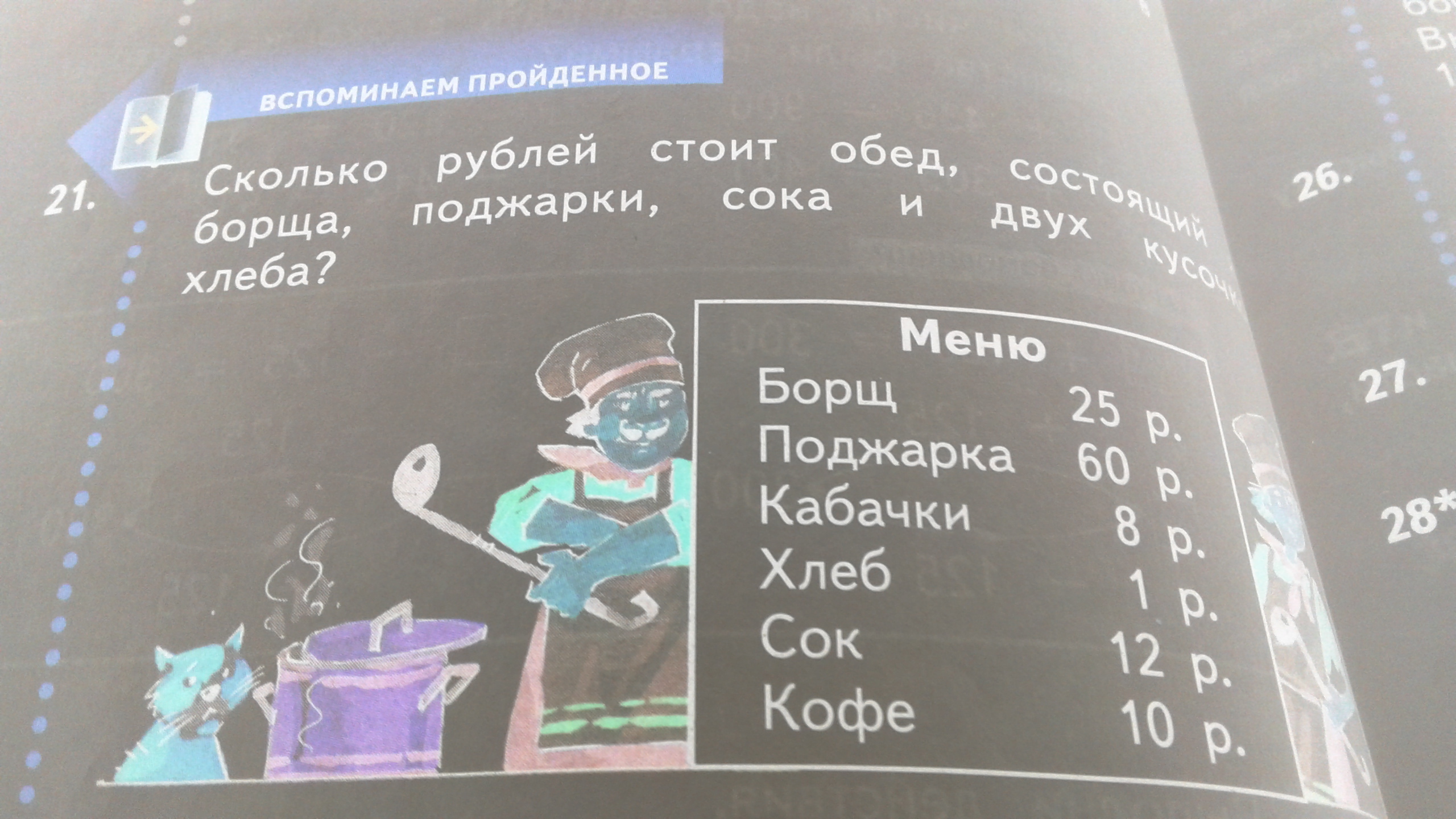 2)85+12=97 (р)-борщ,поджарка,сок.