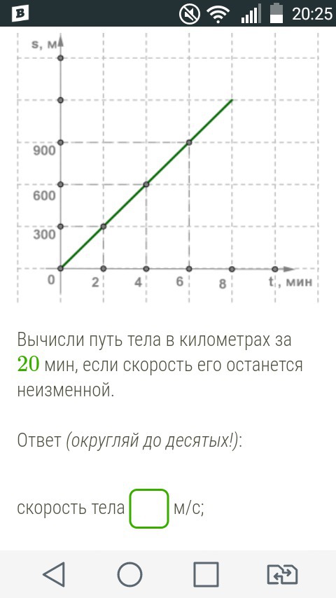 сначала узнаем скорость в метрах за секунду, по графику это 150м/с, множим на 60, чтобы узнать сколько в минуту 150×60=9000 - метров в минуту. Множим на 20 минут 9000×20=180000 - растояние за 20минут в метрах. Делим на 1000м чтобы получить ответ в км 180000÷1000=180км