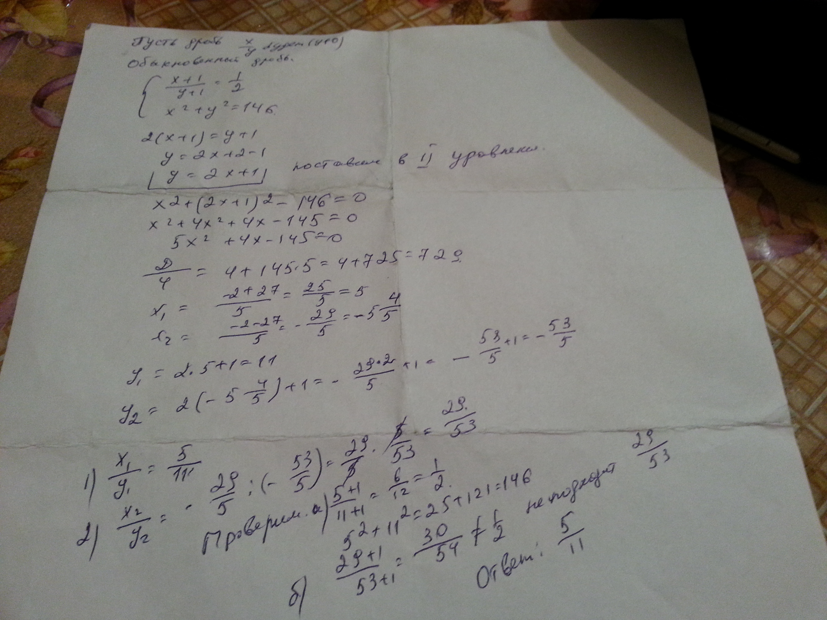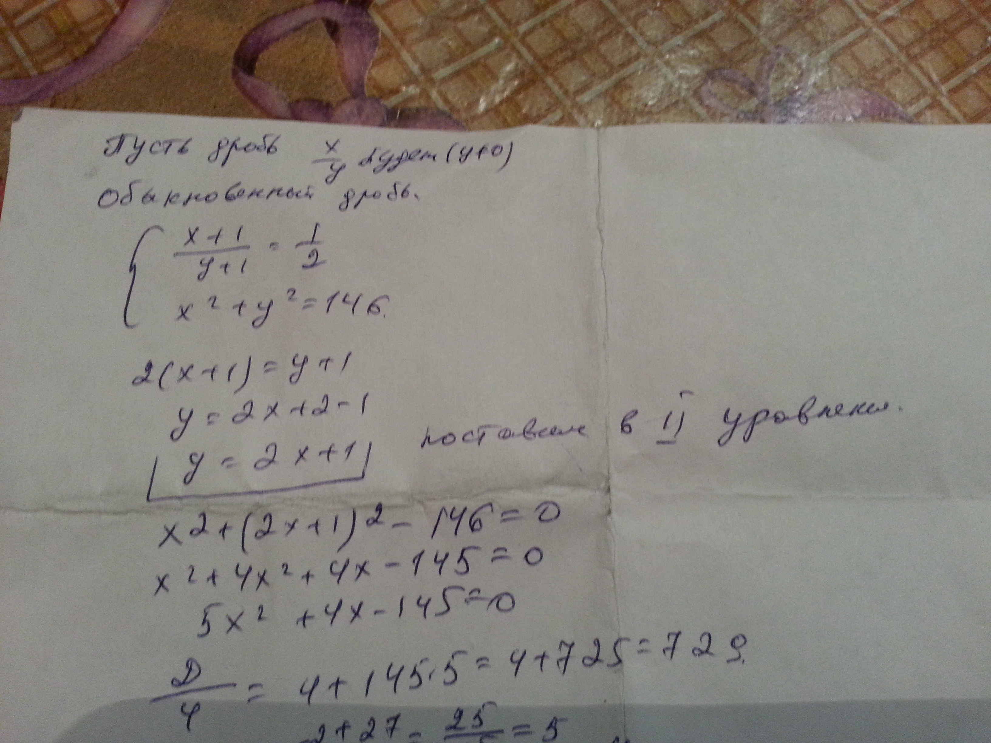 если к числителю и знаменателю обыкновенной дроби добавить по 1, то дробь станет равна 1/2, а если сложить квадраты числителя и знаменателя исходной дроби, то получится 146. Найдите исходную дробь