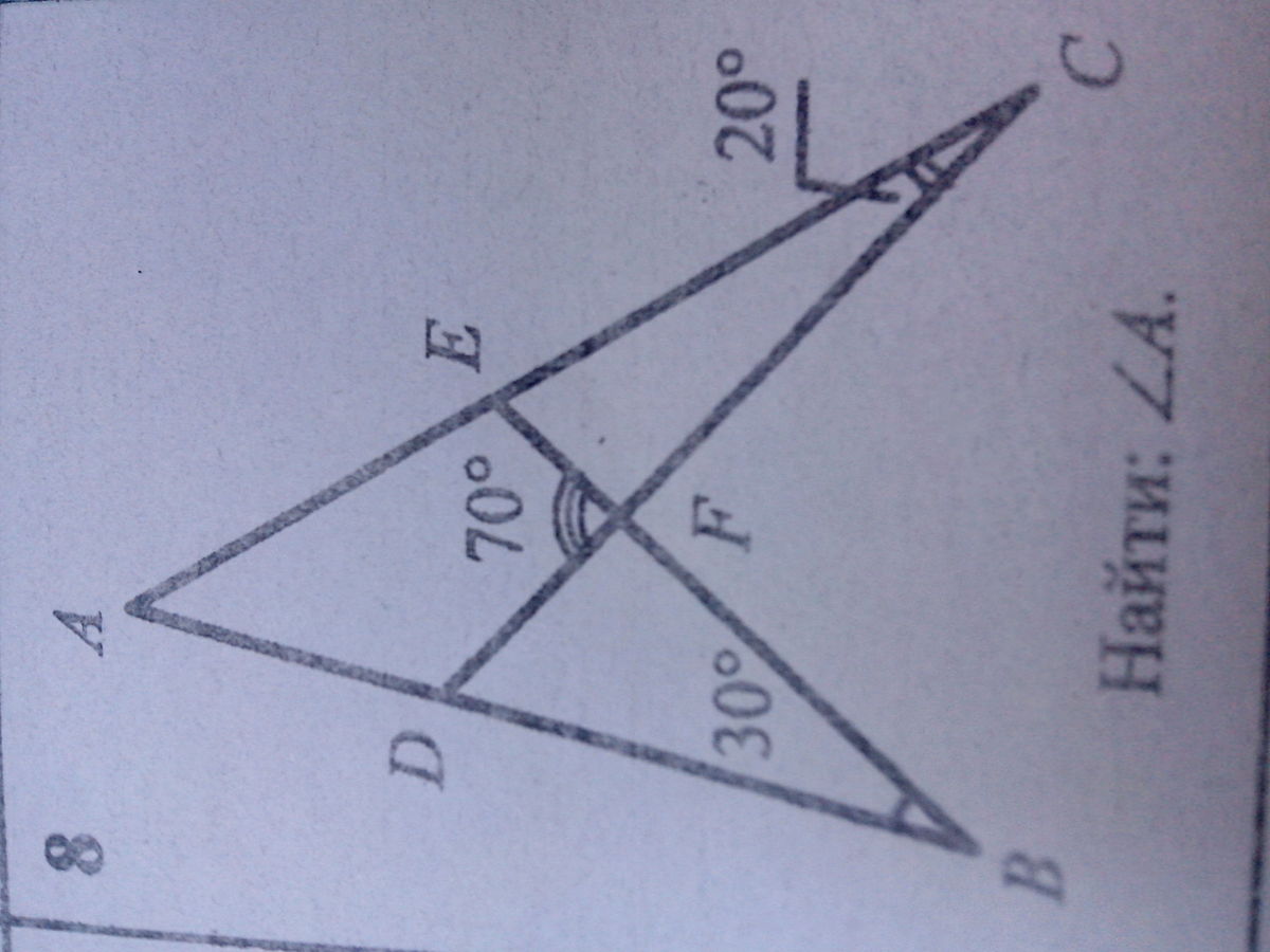 По теореме о сумме углов треугольника (она равно 180 градусов), угол А = 180 градусов - угол В - угол AEB = 180 градусов - 30 градусов - 130 градусов = 20 градусов