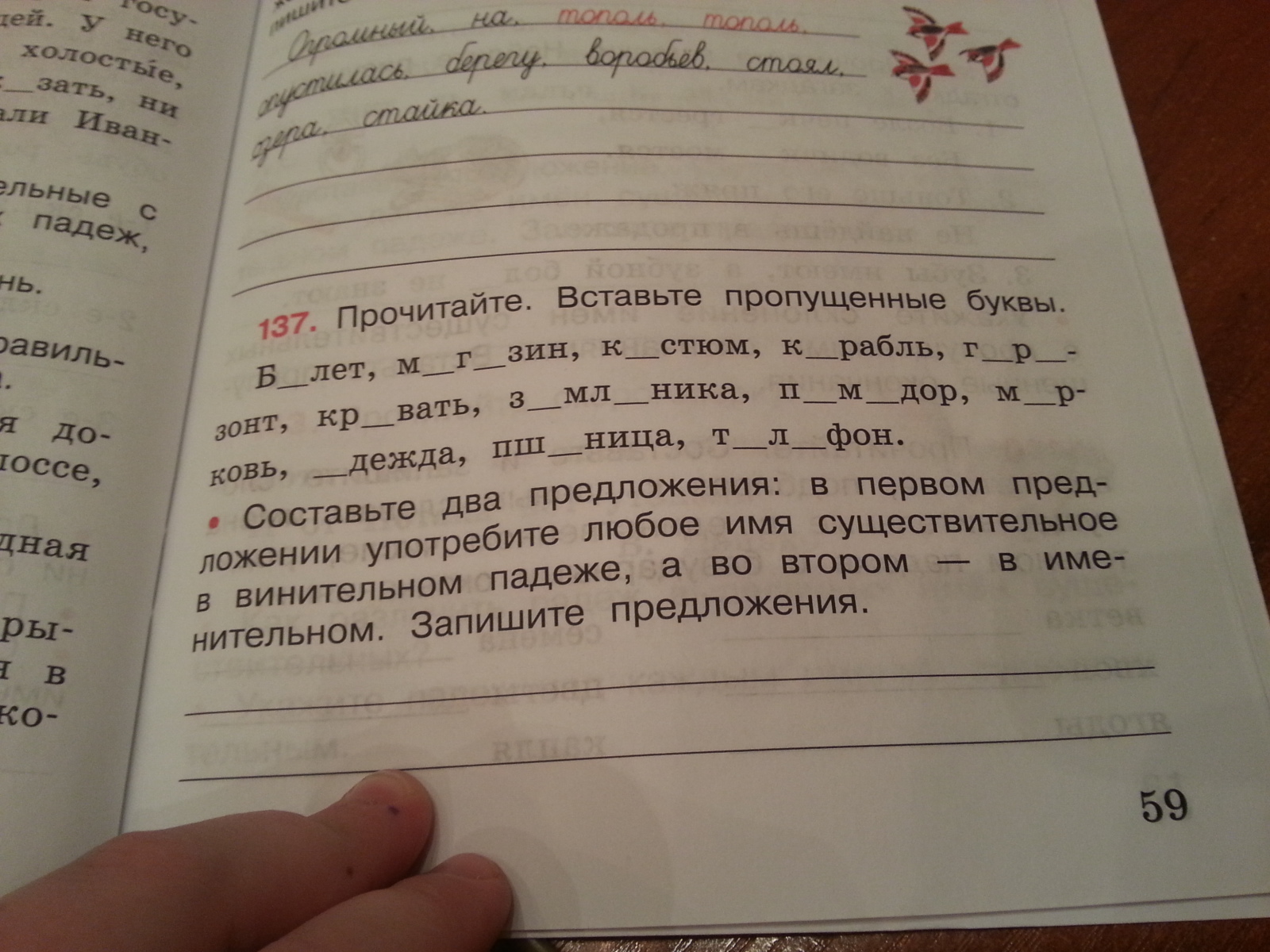 билет, магазин, костюм корабль, горизонт, кровать, земляника помидор, морковь, одежда, пшеница, телефон.
