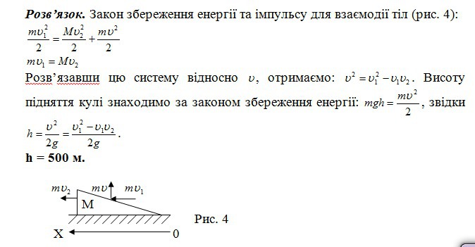 Куля, що летіла горизонтально зі швидкістю 100 м/с, ударяється об нерухомий клин, що лежить на горизонтальній поверхні, і пружно відлітає вертикально вгору. Початкова швидкість клина після удару 2 м/с. Визначте, на яку висоту підніметься куля. Опором повітря знехтувати.