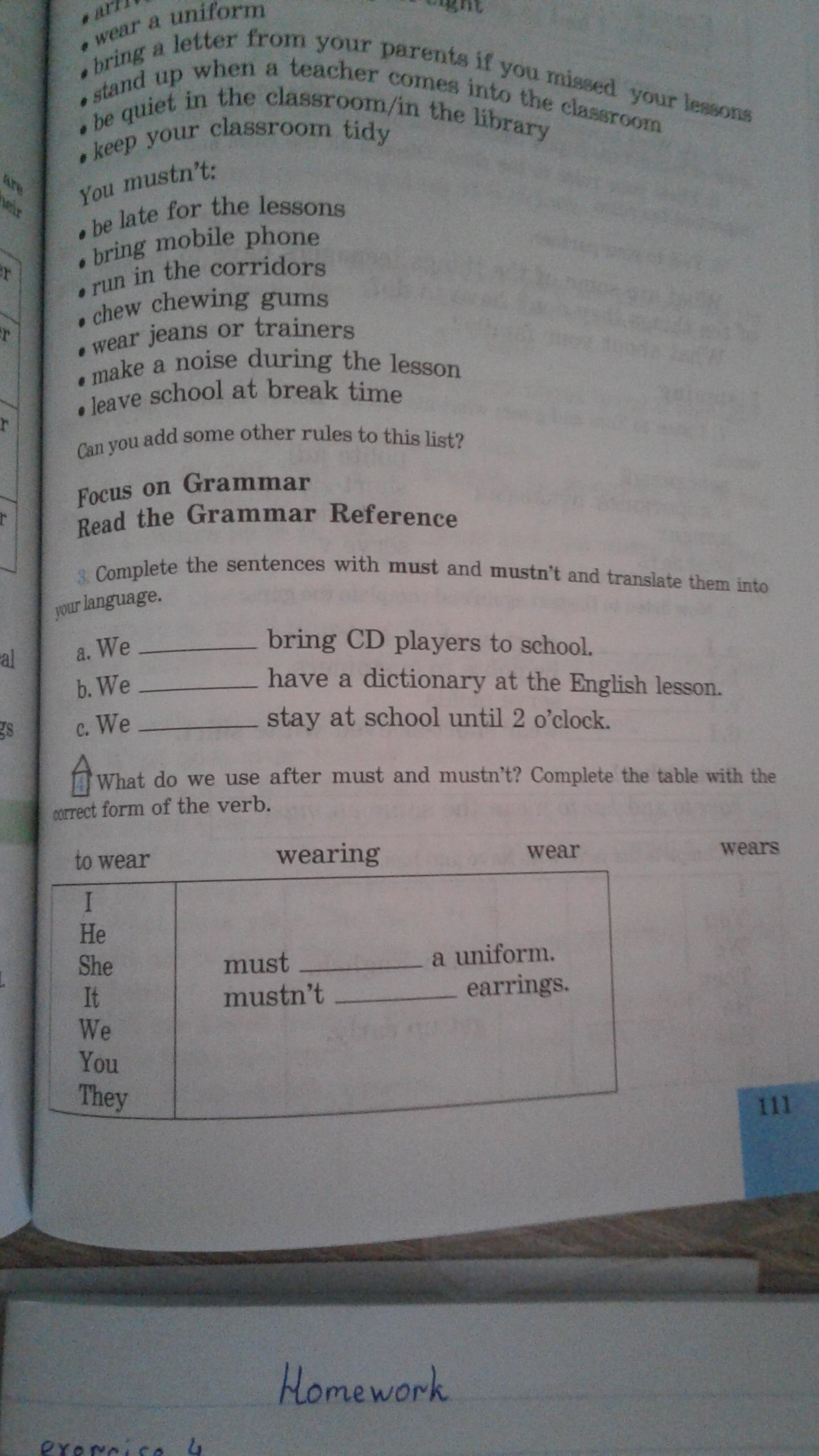 I , he, she, it , you, we, they must ... a uniform. Mustnt..... earrings
