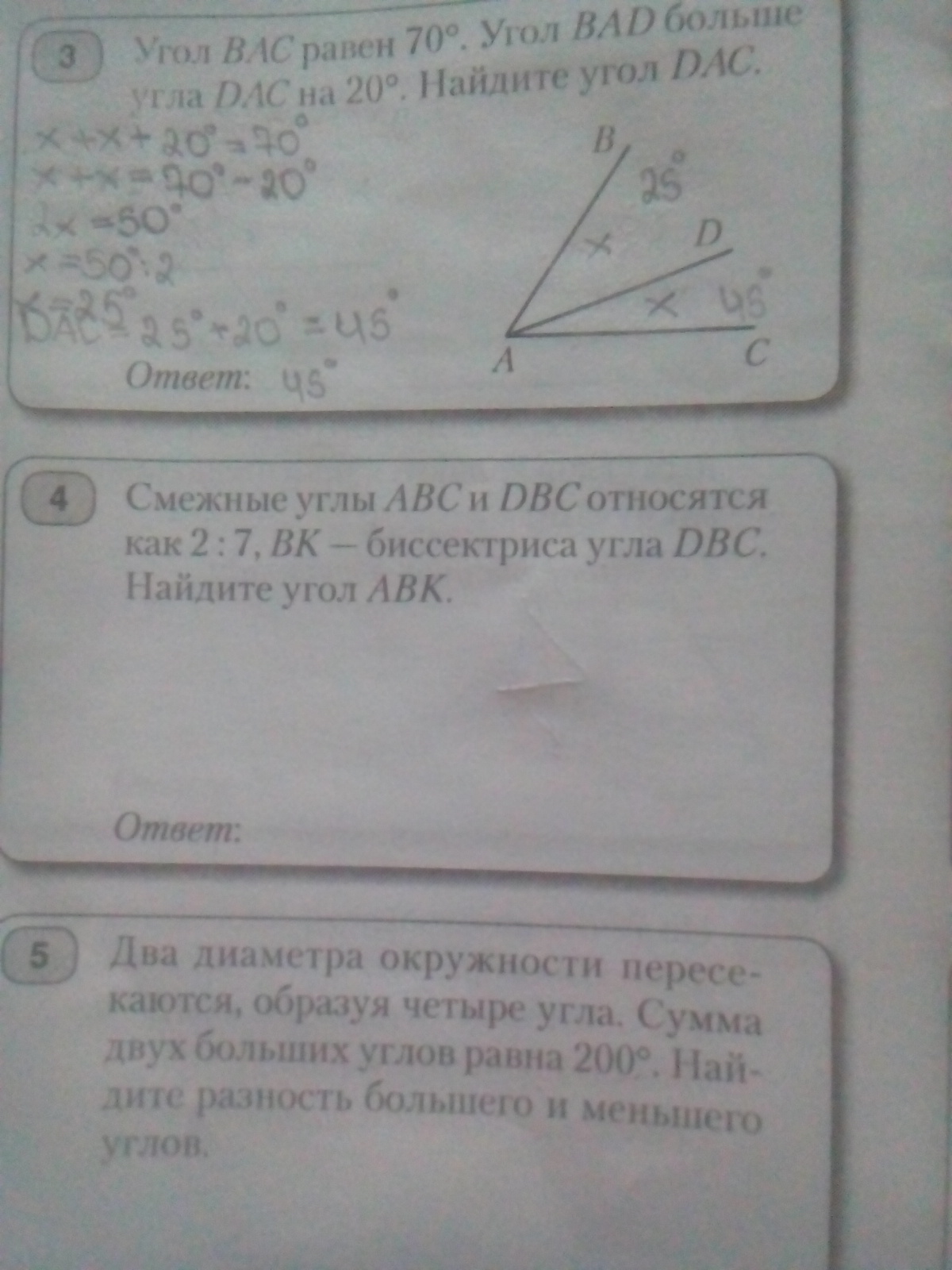 смежные углы ABC и DBC относятся как 2 : 7, BK- биссектриса угла DBC. найдите кгол ABK