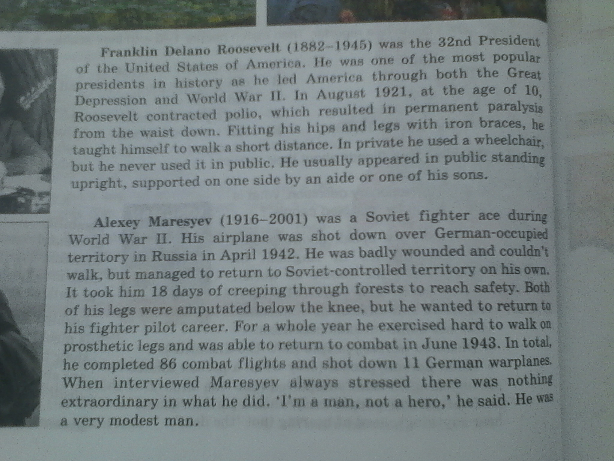 Алексей Маресьев (1916-2001) был Советским летчиком-истребителем во время Первой Мировой войны его самолет был сбит над оккупированной территорией Германии в России в апреле 1942 года. Он был тяжело ранен и не мог ходить. но удалось вернуться к советской территорией по собственному, ему потребовалось 18 дней полз по лесам, чтобы добраться до безопасного места. Обе его ноги были ампутированы ниже колена, но он хотел вернуться в его карьере летчика-истребителя. В течение целого года он осуществлял трудно ходить на протезах ног и смог вернуться к бою в июне 1943 года. В общей сложности. он совершил 86 боевых вылетов и сбил ЛЛ немецкие самолеты. Когда интервью Маресьев всегда подчеркивал, что не было ничего удивительного в том, что он сделал. Я человек, не герой, - сказал он. Он был очень скромным человеком