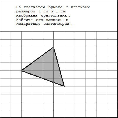 Треугольник вписан в прямоугольник со сторонами 4 и 5 клеток или 4 см и 5 см. Площадь этого прямоугольника получается S=4*5=20 см². Можно из площади прямоугольника вычесть площади незакрашенных треугольников и так найдём площадь закрашенного треугольника. Итак площадь первого треугольника, который находится справа от закрашенного равна половине площади прямоугольника со сторонами 1 см и 5 см, то есть s₁=1*5:2=2,5 см². Площадь второго треугольника, который находится слева от закрашенного равна половине площади квадрата со стороной 3 см, то есть s₂=3*3:2=4,5 см². Площадь третьего треугольника, который находится внизу, равна половине площади прямоугольника со сторонами 2 см и 4 см, то есть s₃=2*4:2=4 см². После того как мы нашли площади всех незакрашенных треугольников, можем найти площадь закрашенного: s=S-s₁-s₂-s₃=20-2,5-4,5-4=9 см²