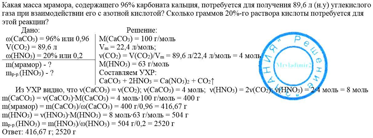 какая масса мрамора, содержащего 96% карбоната кальция, потребуется для получения 89,6 л(н.у) углекислого газа при взаимодействии его с азотной кислотой?Сколько граммов 20%-го раствора кислоты потребуется для этой реакции?