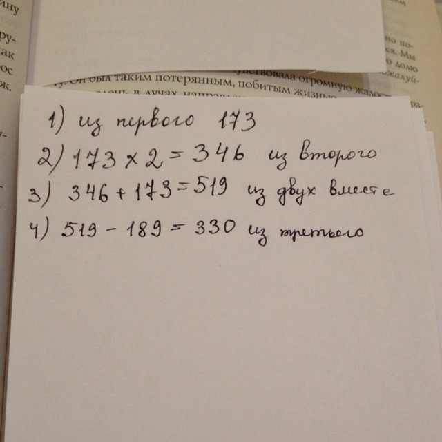 На расчистку дороги от снежных заносов из одного села пришли 173 человека, из другого в 2 раза больше, чем из первого,а из третьего - на 189 человек меньше,чем из двух других вместе.