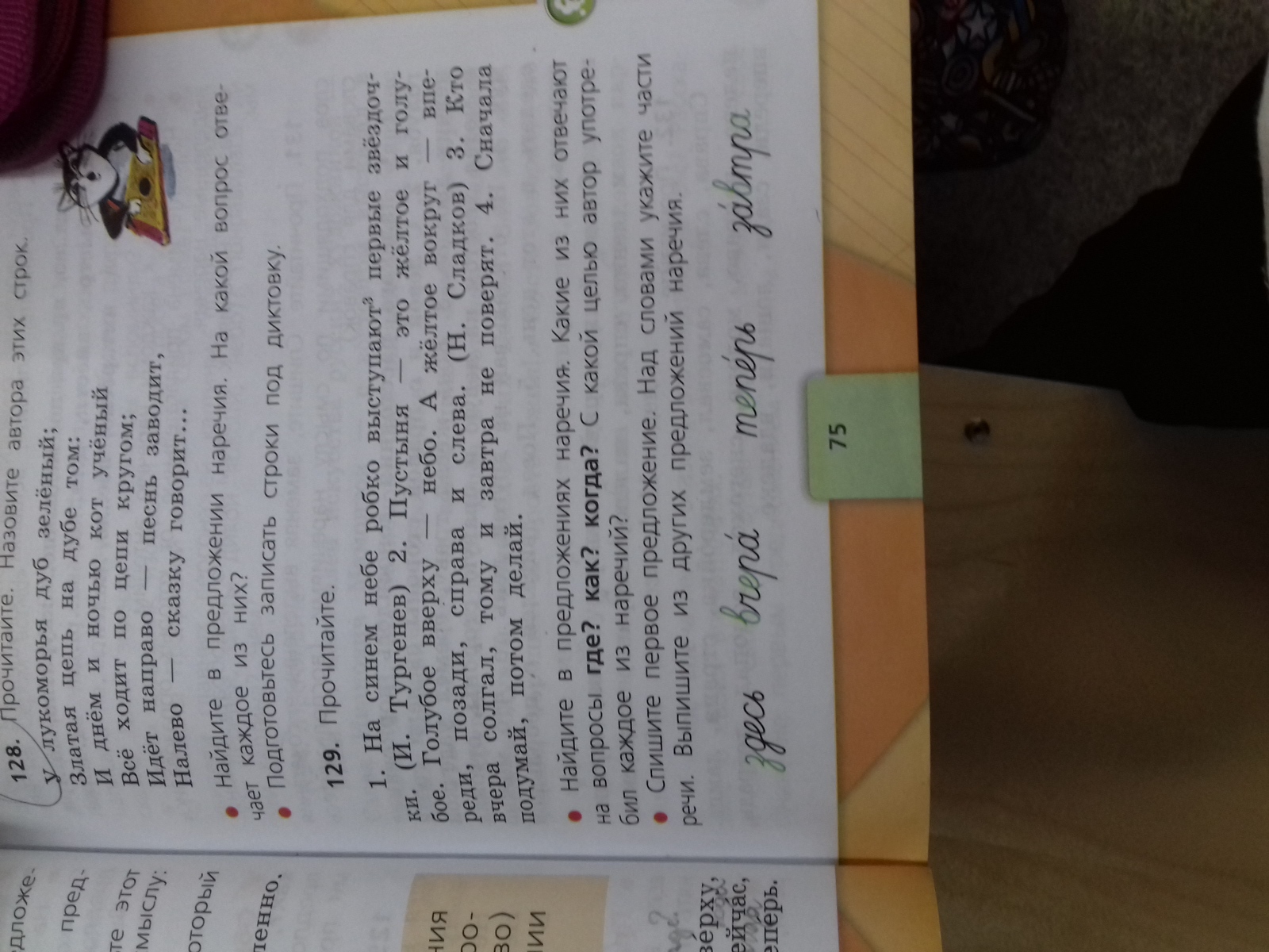 Наречия: робко(как?), вверху (где?), вокруг (где?),впереди (где?), позади (где?),справа (где?), слева (где?), вчера (когда?), завтра (когда?), сначала (когда?), потом (когда?).