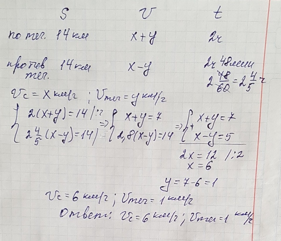 Расстояние между двумя пунктами по реке равно 14 км. Лодка проходит этот путь по течению за 2 ч,а против течениЯ за 2 ч 48 мин . найдите собственную скорость лодки и скорость течения реки