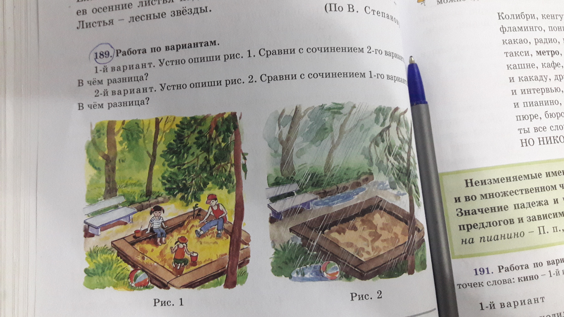Рис 2.Нет детей играющих, в песочнице.Льёт дождь ,слякоть ,холод ,не очень приятная погода .Холодная и грустная картина .