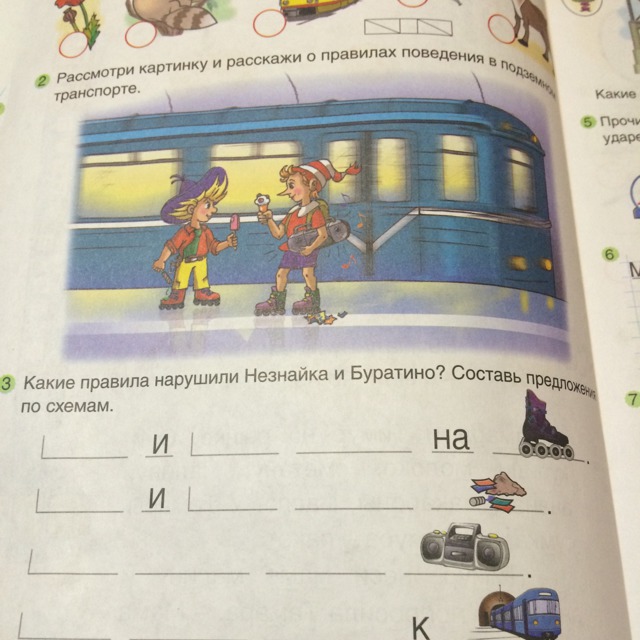 Буратино и незнайкт котаютса на роликах.2 Буратино и незнайко кидают мусар.3 Буратино слушает громко музыку.4 они подошли близко к поезду