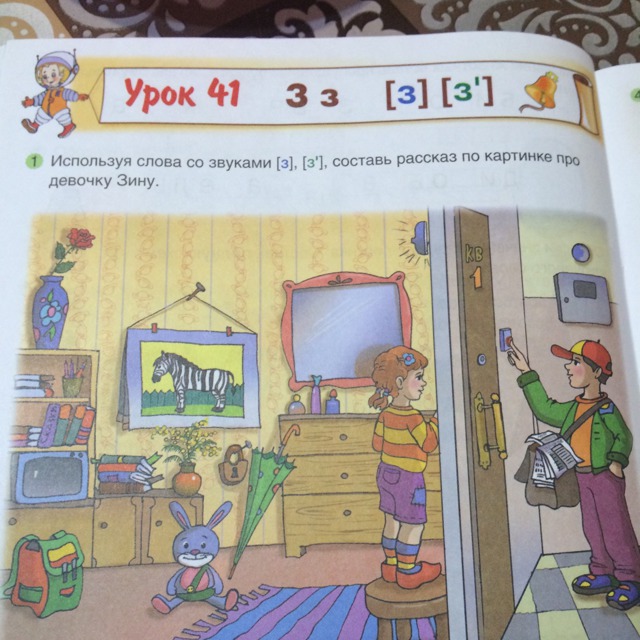 Утром к девочке Зине пришёл почтальон с газетой и зазвонил в звонок. Зина подошла к двери и посмотрела в глазок. Зина взяла газету и зашла обратно в квартиру. В комнате стоял шкаф с вазой, в которой была роза, телевизор, на стене висела картина с зеброй, зеркало и замок, а на полу лежал плюшевый заяц и зонтик.