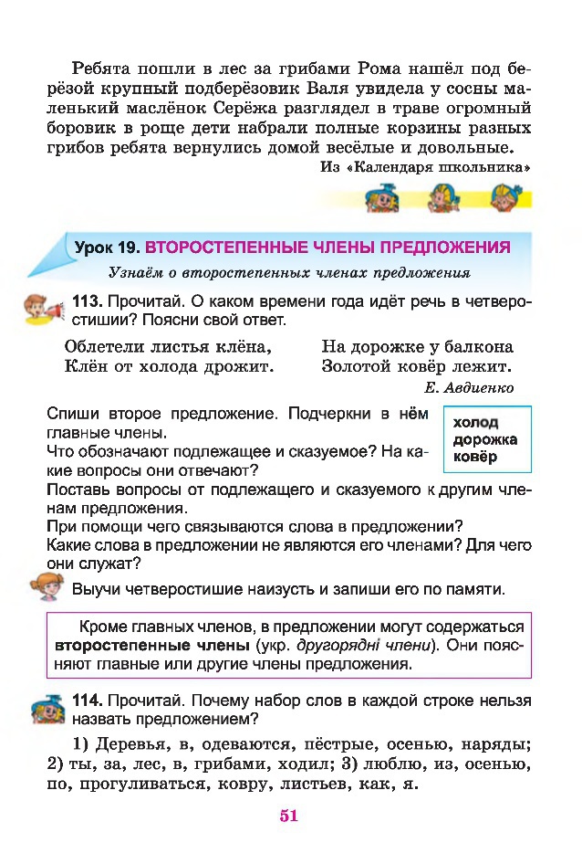 Ребята пошли в лес за грибами(ребята -подлежащее, пошли - сказуемое). Рома нашел под березой крупный подберезовик. (Рома нашел)