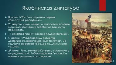 ЯКОБИНСКАЯ ДИКТАТУРАреволюционно-демократич. диктатура, являвшаяся высшим этапомФранцузской буржуазной революции конца 18 века. Была установлена в результате нар. восстания 31 мая-2июня 1793, приведшего к власти якобинцев (отсюда утвердившееся за ней в историч. лит-ре назв.). Опираласьна революц. блок гор. мелкой и ср. буржуазии, большинства крестьянства и плебейских масс. Я. д.установилась в тяжелых условиях, когда развязанные внутр. врагами мятежи (роялистов в Вандее,жирондистов в Бордо, Тулузе, Лионе и др. франц. городах), контрреволюц. террор, иностр. интервенция,экономич. трудности поставили франц. республику на грань катастрофы. Правовое оформление системывласти Я. д. осуществлялось постепенно и было завершено декретами 10 окт. и 4 дек. 1793, учредившими воФранции "временный революц. порядок управления" (введение в действие принятой 24 июня 1793 якобинскойконституции 1793 было отложено). Полнота законодат. и исполнит. власти сосредоточилась в руках Конвентаи его комитетов, среди к-рых Комитет общественного спасения (с 27 июля фактически возглавлявшийся М.Робеспьером) играл гл. роль, являлся в сущности революц. пр-вом и руководил всей гос. жизнью страны.Комитет общественной безопасности и Революционный трибунал были карательными органами Я. д. (их осн.задачей была борьба против внутр. контрреволюции). В департаменты и в армии направлялись облеченныечрезвычайными полномочиями комиссары Конвента. Централизация власти в руках якобинского пр-васочеталась с широкой инициативой нар. масс и их орг-ций.