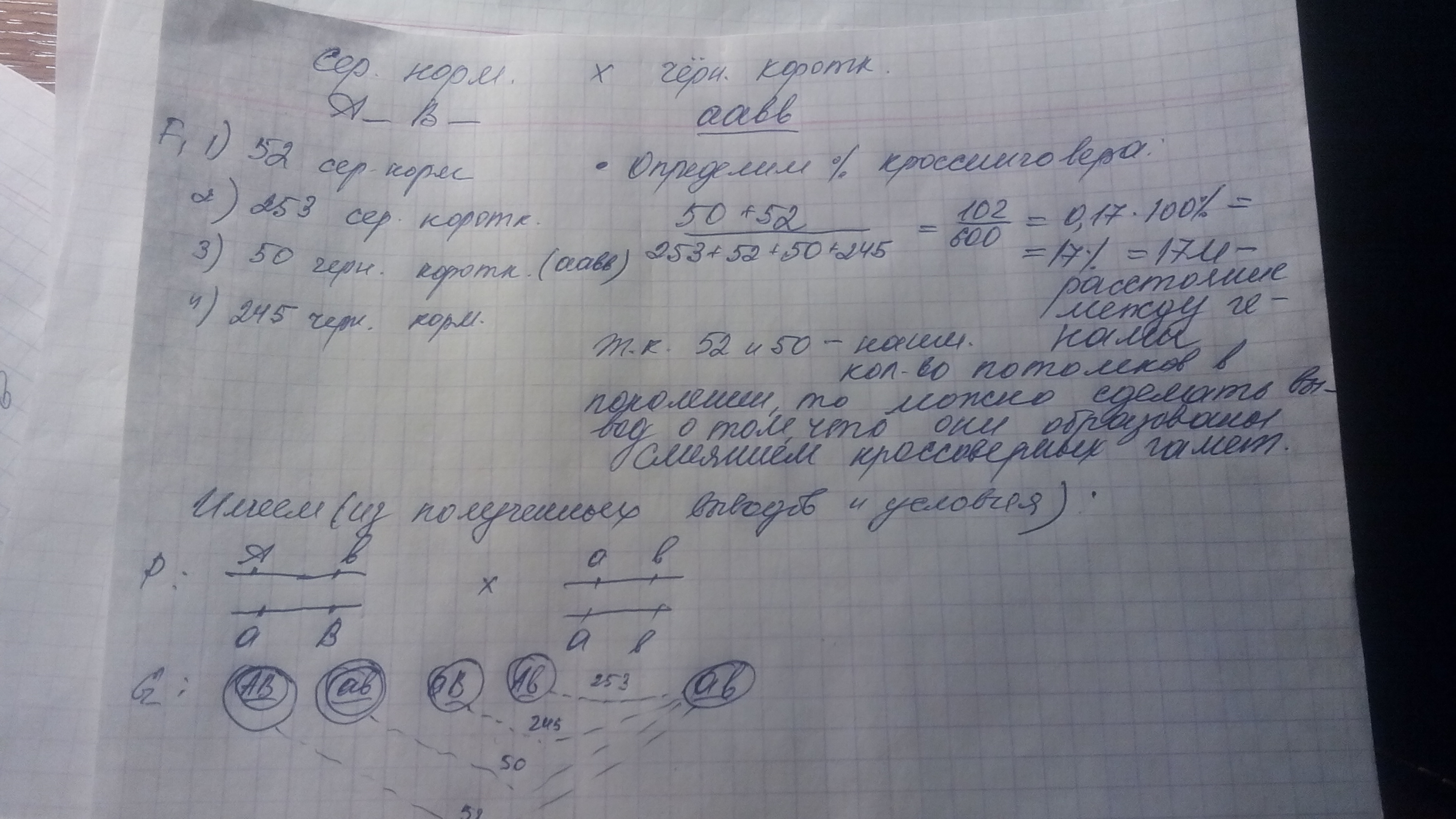 У дрозофилы гены окраски тела и строения крыльев локализованы в одной из шести аутосом. Самку с серым телом и нормальными крыльями скрестили с чорнотілим короткокрилим самцом (оба признака - рецессивные). В первом поколении получили 52 серые мушки с нормальными крыльями, 253 серых короткокрилих, 50 черных короткокрилих и 245 черных с нормальными крыльями. Определите исходные группе сцепления и расстояние между анализируемыми генами в хромосоме