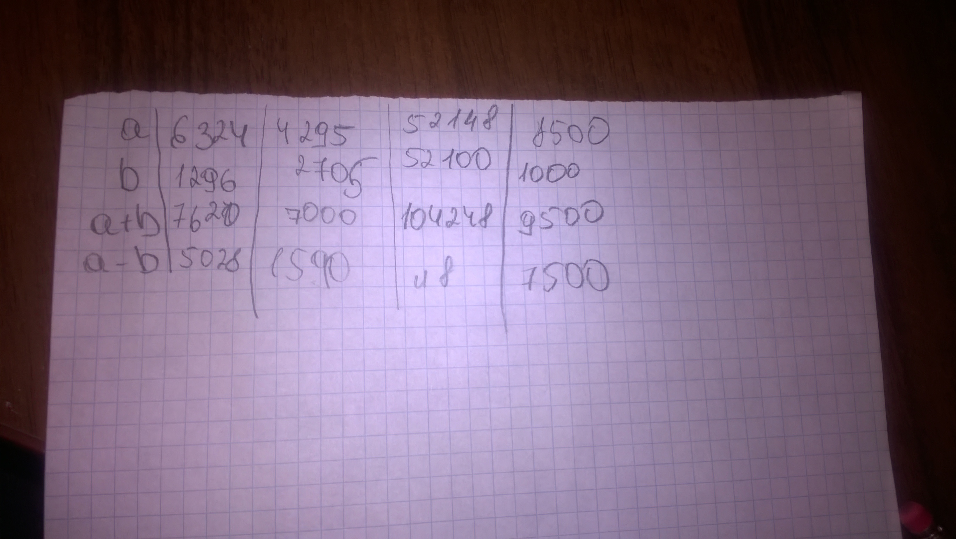 Первая таблица: а+b=6324+1296=7620,а a-b=6324-1296=5028. Вторая а=a+b и вычитаешь b a=7000-2705=4295, а a-b=4295-2705=1590, третья b=52148-48=52100 это b a+b=52148+52100=104248 и 4 таблица a=9500-1000=8500 a-b=8500-1000=7500