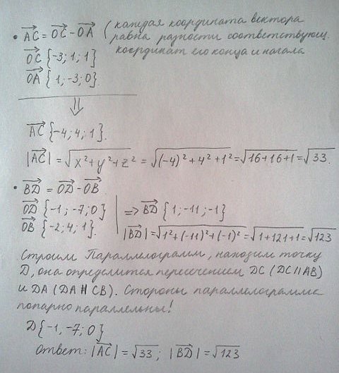 Найти координаты BD,если BD -диагональ параллелограмма ABCD ,где А (1;-3;0), В(-2;4;1), С(-3;1;1)