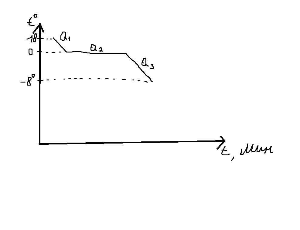 2) Какое количество теплоты должен отобрать холодильник у 1,5 кг воды, имеющей температуру 18°С, чтобы превратить её в лед с температурой -8°С? Постройте график процесса.