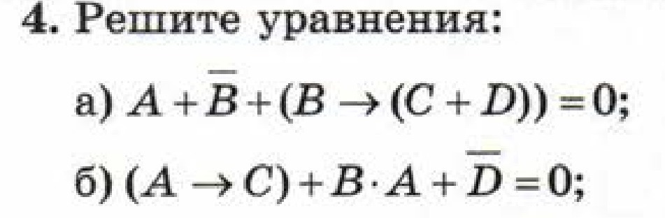 Суть решения очень проста: при помощи преобразований свести левую часть выражения к дизъюнкции набора переменных, т.е. некоей a ИЛИ b ИЛИ ... Тогда, если в правой части ноль, то ответом будет инверсия каждого элемента дизъюнкции.